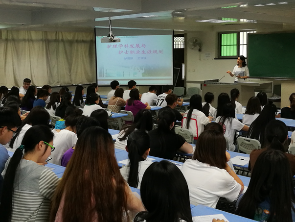 王引侠结合咸阳市第一人民医院的情况,给同学们细致的讲解了护理学科发展现状及趋势、护理专业技术岗位等行业知识。从自身多年的工作经历、医院的工作要求给同学们提出护士职业素质要求,提醒同学们调整心态,变被动为主动学习,奠定基础。